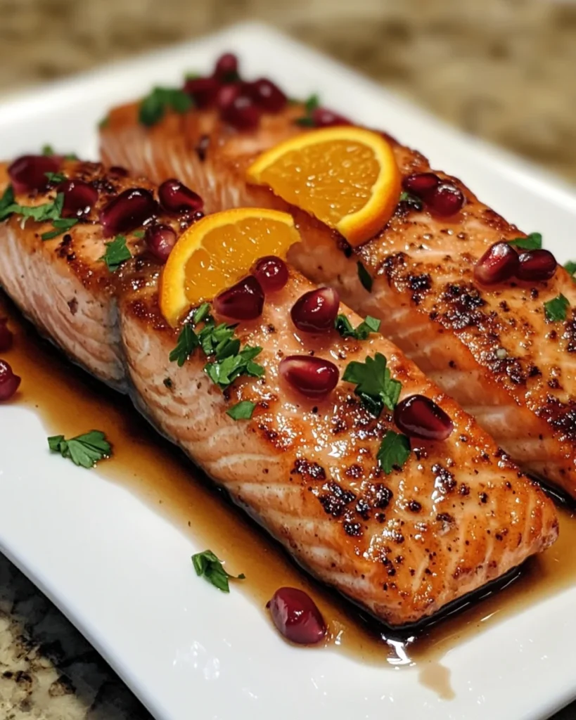- Serve the salmon on a platter, drizzled with pomegranate glaze and garnished with pomegranate seeds, orange slices, and fresh herbs.