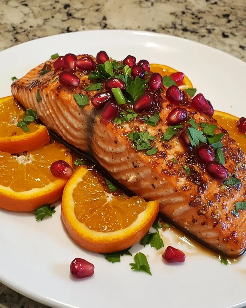 - Serve the salmon on a platter, drizzled with pomegranate glaze and garnished with pomegranate seeds, orange slices, and fresh herbs.