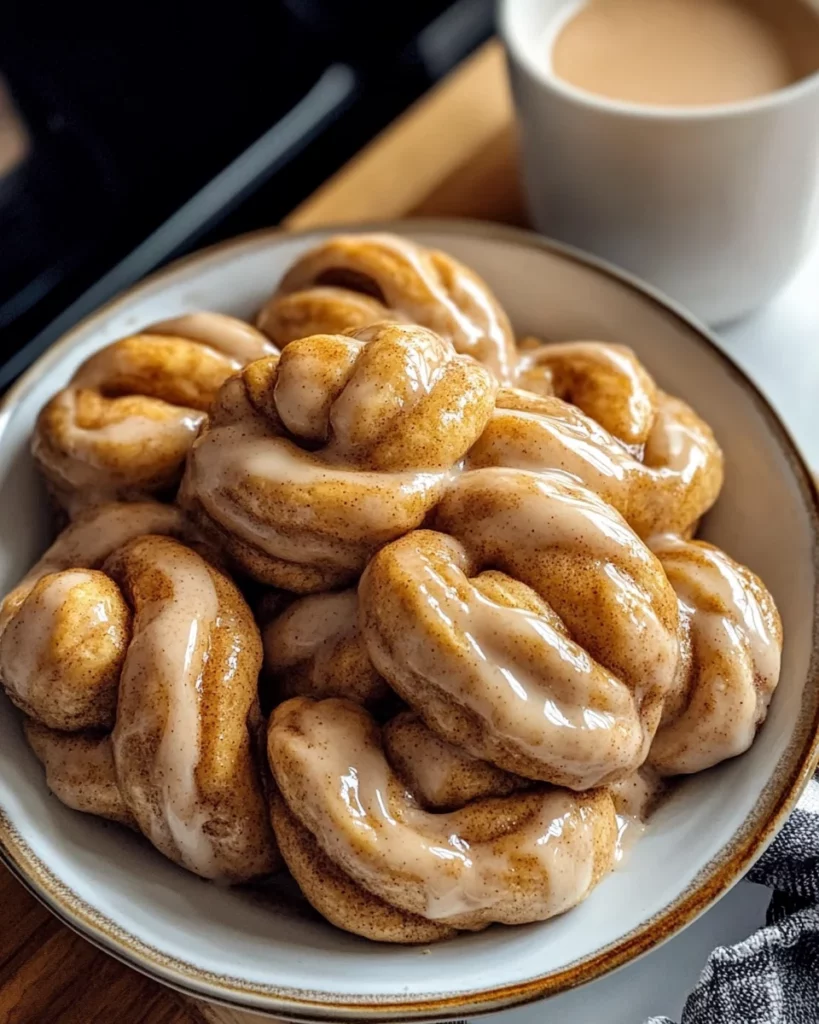 Delicious cinnamon knots drizzled with rich coffee icing, perfect for a sweet treat.