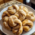 - Shape the Knots: Punch down the dough and roll it out on a lightly floured surface into a 12×16-inch rectangle. Spread the cinnamon filling evenly over the dough. Fold the dough in half lengthwise to create a long rectangle. Cut into 12 equal strips. Take each strip, twist it gently, and tie it into a knot. Place the knots on a parchment-lined baking sheet, tucking the ends underneath.