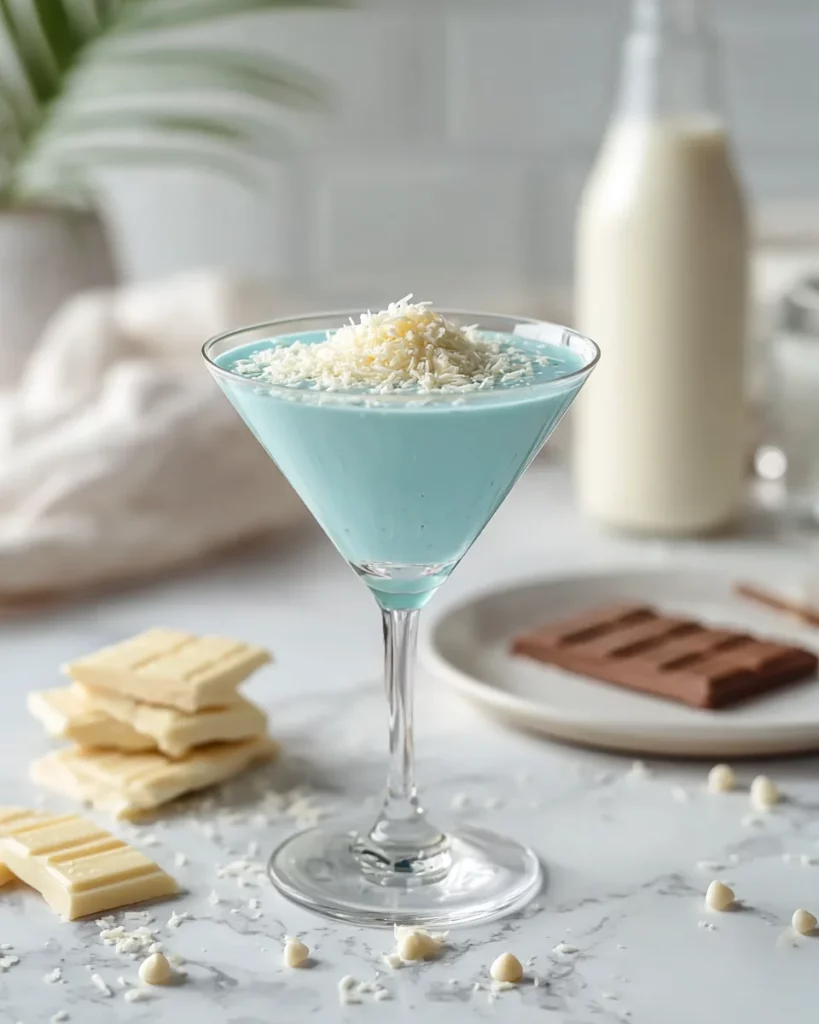 - In a shaker, combine White Chocolate Liqueur, vanilla vodka, blue curaçao, and heavy cream.
