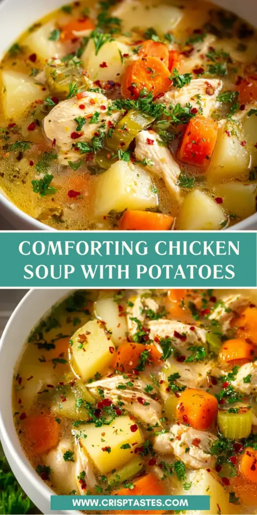 There’s something magical about a warm bowl of comforting chicken soup with potatoes. It’s not just a meal; it’s a cherished moment of warmth and connection. As the flavors meld and the aromas envelop your kitchen, you’ll feel the stress of the day melt away. This recipe brings not only nourishment but also a cozy gathering with loved ones, creating memories you’ll treasure. So next time you need a comforting hug in a bowl, remember this delightful dish. It’s more than food; it’s a delicious reminder of home and heart, ready to warm your soul!