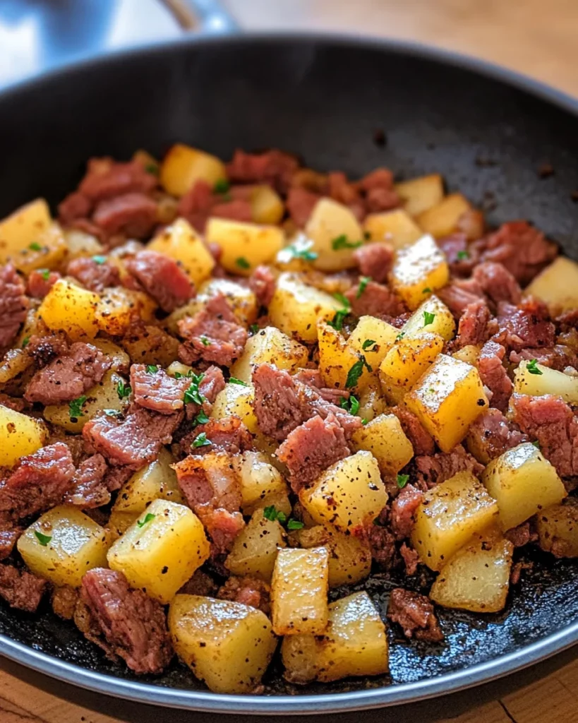 A delicious and hearty dish made with corned beef, potatoes, and onions, perfect for breakfast or brunch.