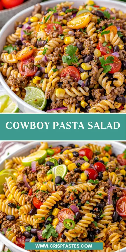 A delicious and hearty Cowboy Pasta Salad featuring ground beef, colorful vegetables, and a zesty dressing, perfect for gatherings.