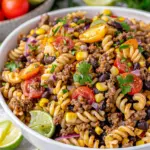 It’s time to bring everything together! Start by adding the cooled pasta to the dressing in the serving bowl. Then, mix in the cooked ground beef, thawed corn, rinsed black beans, diced bell peppers, halved cherry tomatoes, jalapeño, and sliced green onions. Gently toss everything until well combined. It’s a beautiful medley of colors and textures that will surely brighten up your meal. The goal is to ensure that each delightful ingredient gets its moment to shine!