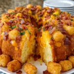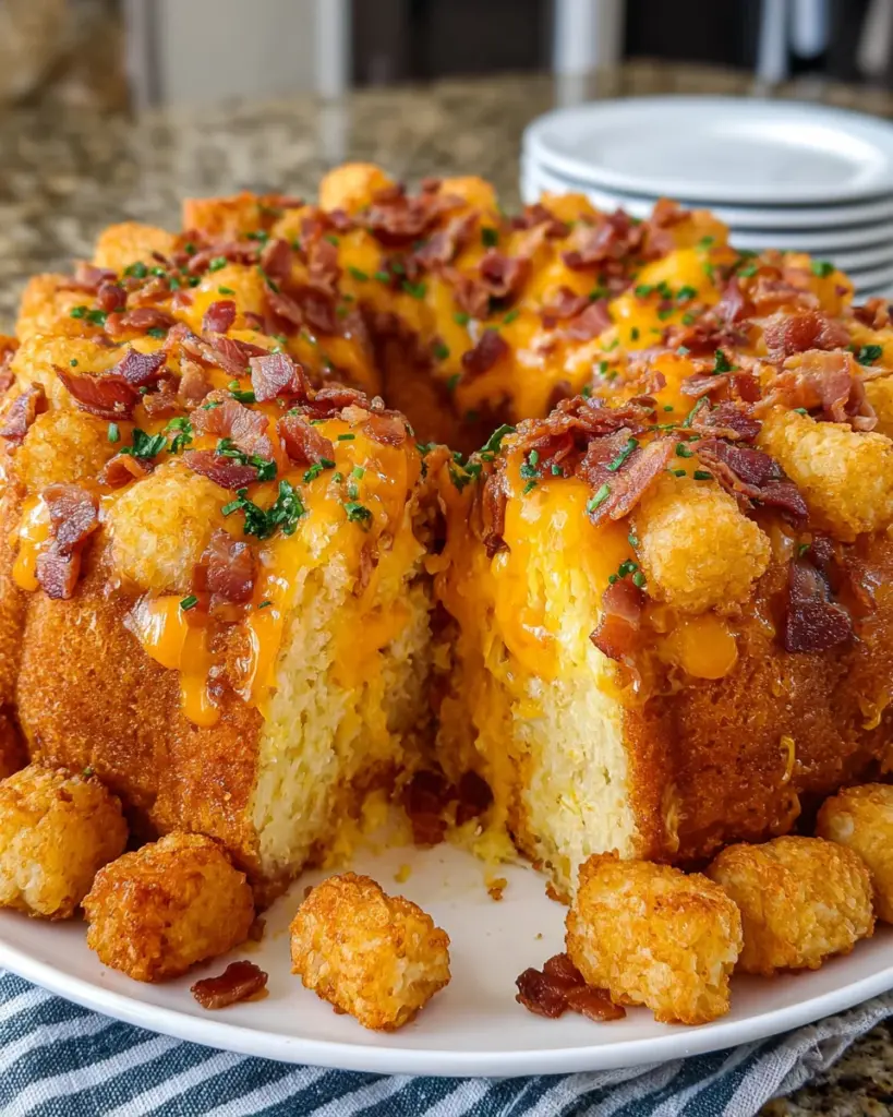 A delicious and savory breakfast bundt cake featuring bacon, tater tots, and cheddar cheese, perfect for brunch gatherings.
