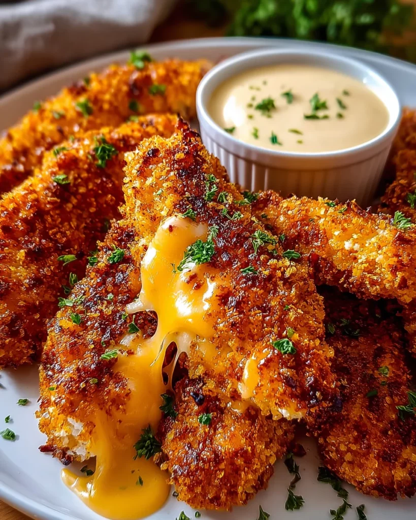 - Serve these golden, cheesy tenders hot with your favorite dipping sauce—think ranch, honey mustard, or barbecue. Enjoy!