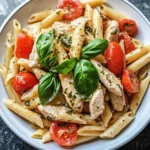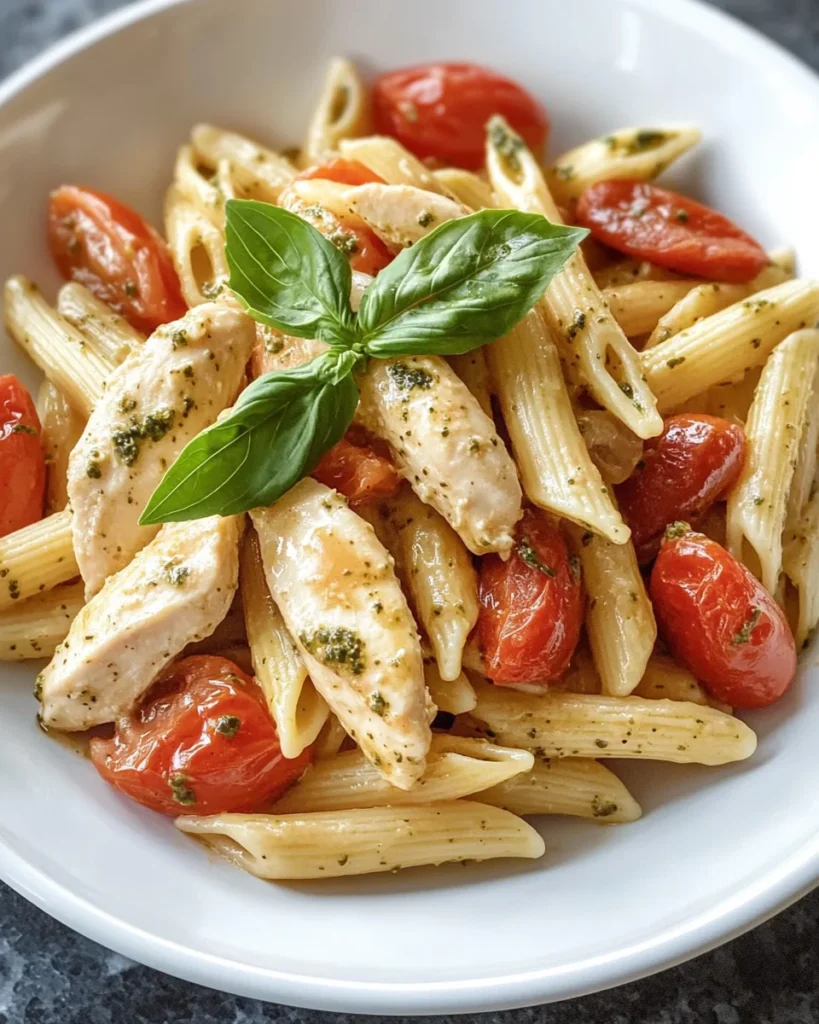 A creamy and flavorful pasta dish featuring chicken, tomatoes, and basil pesto, perfect for a delightful dinner.