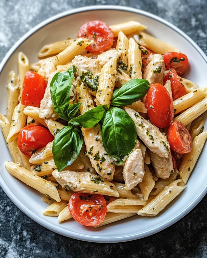 A creamy and flavorful pasta dish featuring chicken, tomatoes, and basil pesto, perfect for a delightful dinner.