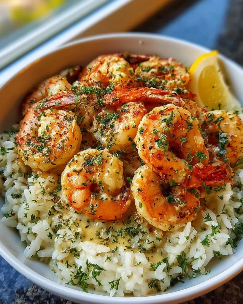 A delicious and creamy garlic butter shrimp bowl served with herb-infused rice.