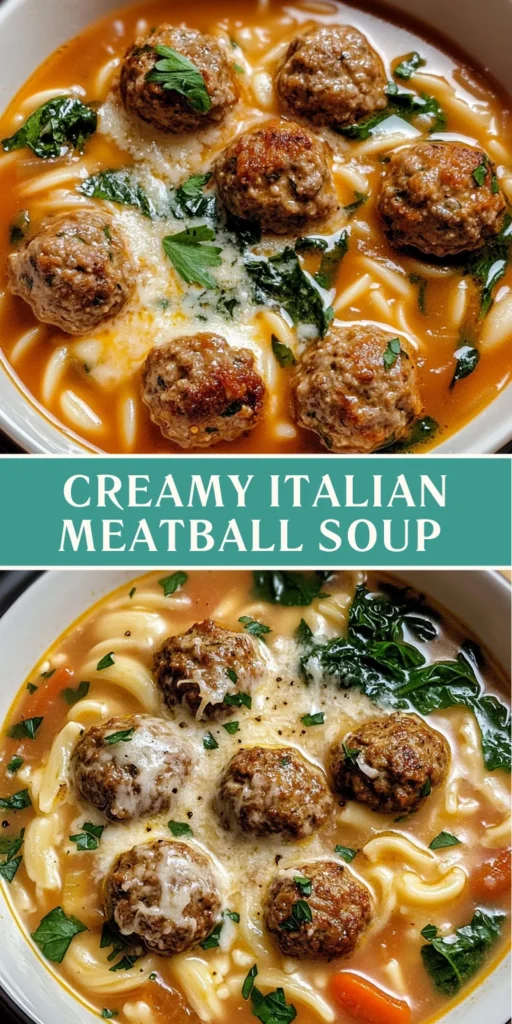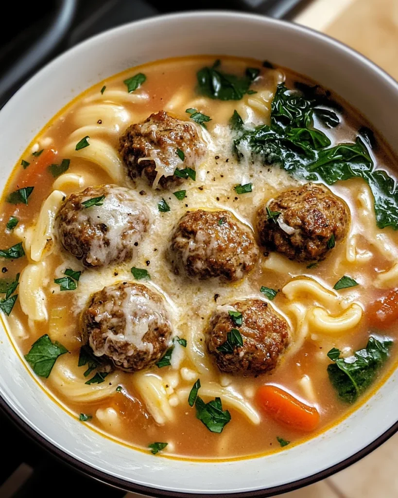 A comforting and creamy Italian meatball soup that combines hearty meatballs, rich broth, and fresh vegetables, perfect for chilly evenings.
