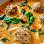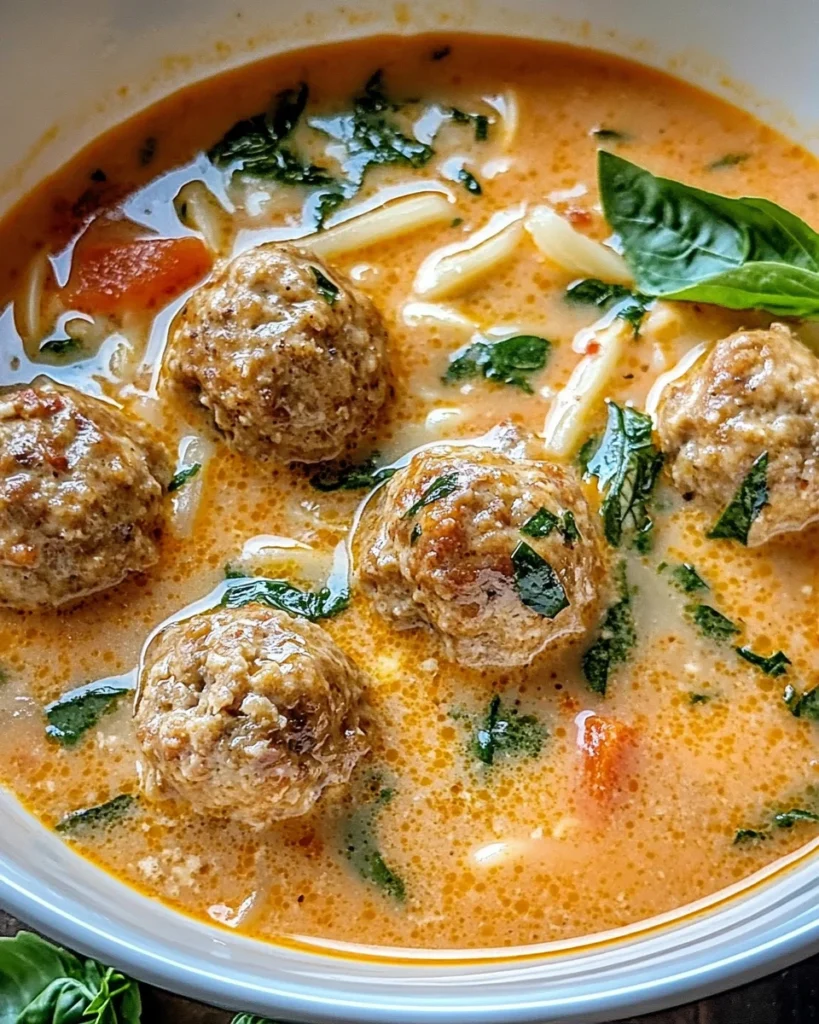 A comforting and hearty soup featuring tender meatballs in a creamy Italian broth, perfect for warming up on a chilly day.
