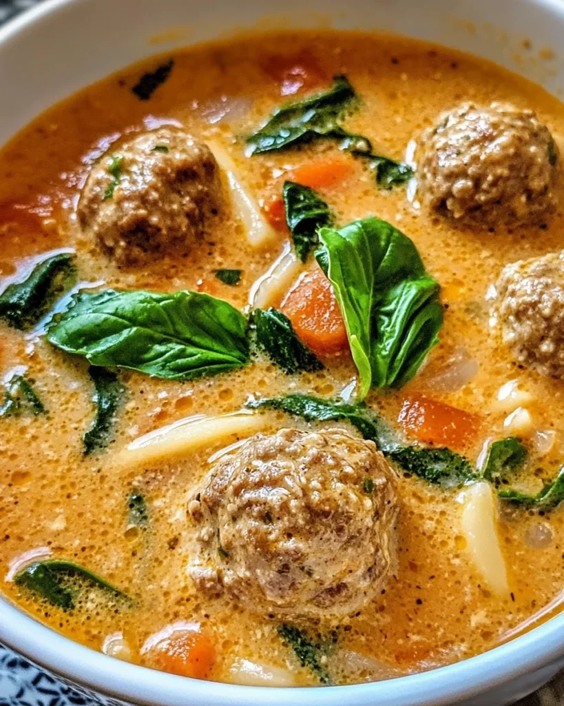 A comforting and hearty soup featuring tender meatballs in a creamy Italian broth, perfect for warming up on a chilly day.
