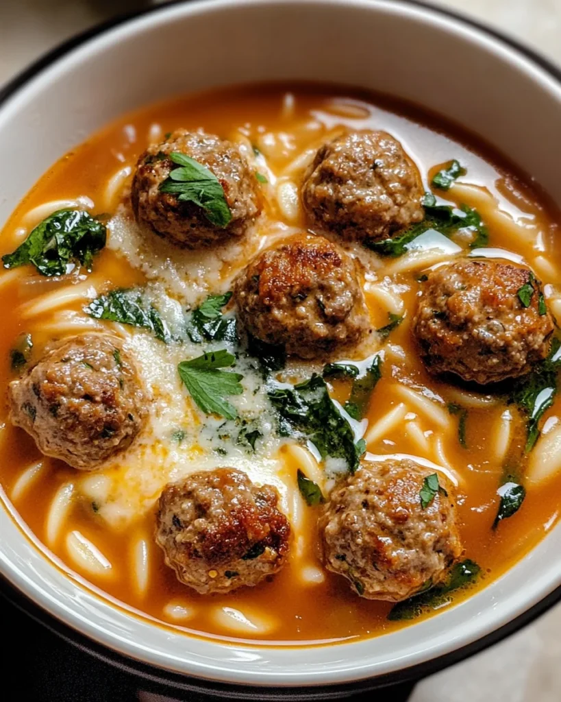A comforting and creamy Italian meatball soup that combines hearty meatballs, rich broth, and fresh vegetables, perfect for chilly evenings.