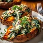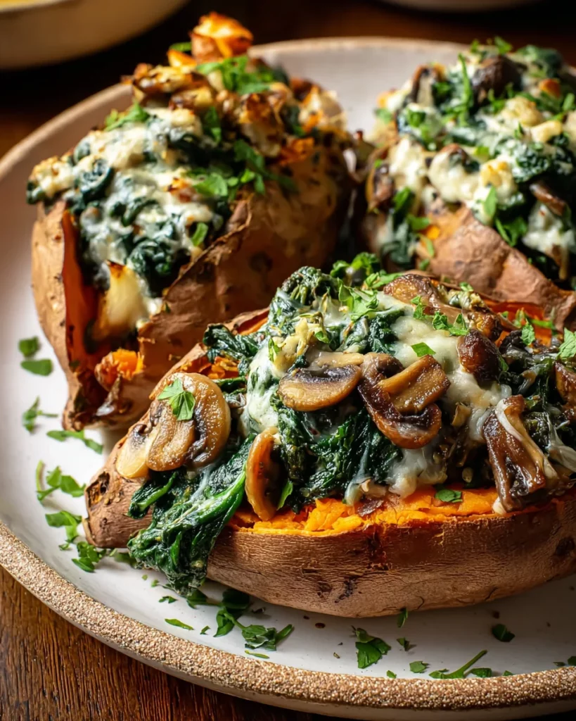 Creamy Mushroom and Spinach Stuffed Sweet Potatoes are a delightful blend of flavors and textures, combining tender sweet potatoes with a rich, creamy filling.