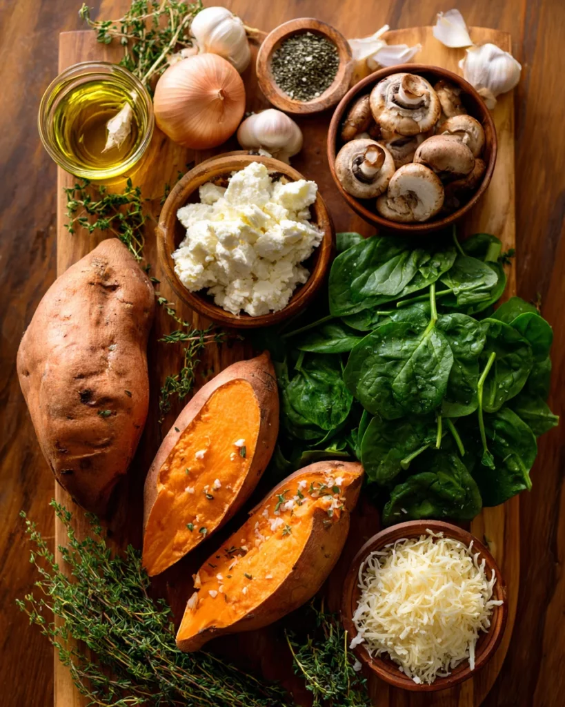 Ingredients for Creamy Mushroom and Spinach Stuffed Sweet Potatoes