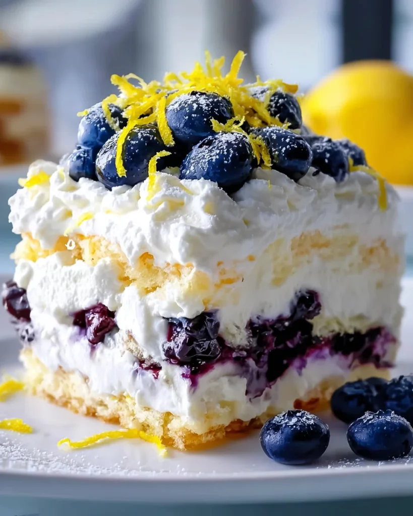 - Before serving, pipe whipped cream swirls on top, scatter fresh blueberries, and sprinkle lemon zest. Garnish with mint.