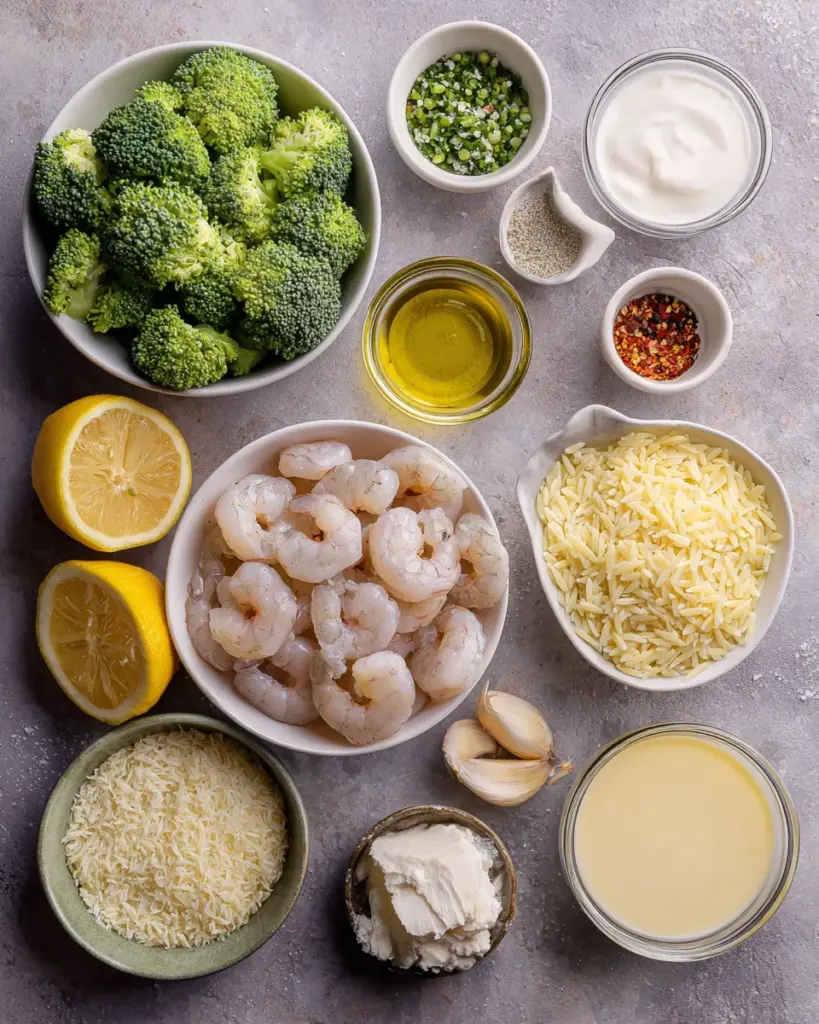 Ingredients for Creamy Orzo Shrimp Broccoli