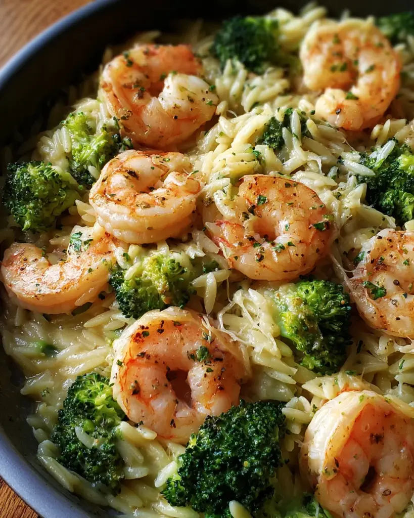 A flavorful and creamy dish combining tender shrimp, fresh broccoli, and orzo pasta in a rich sauce.