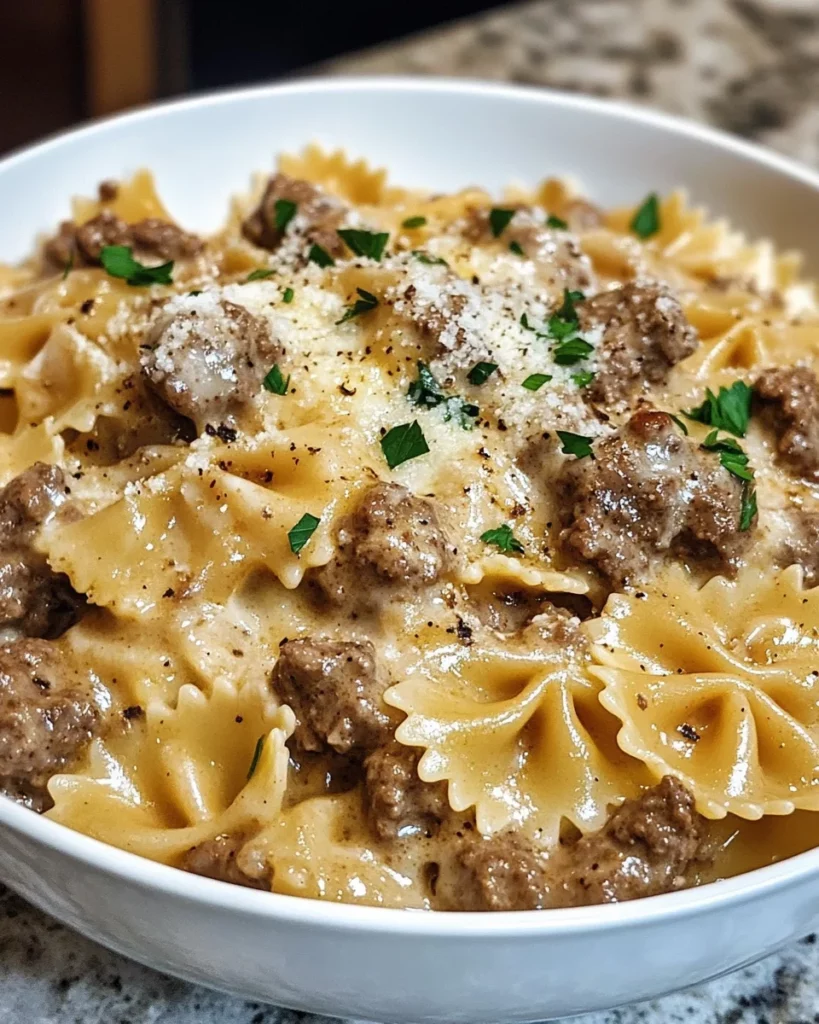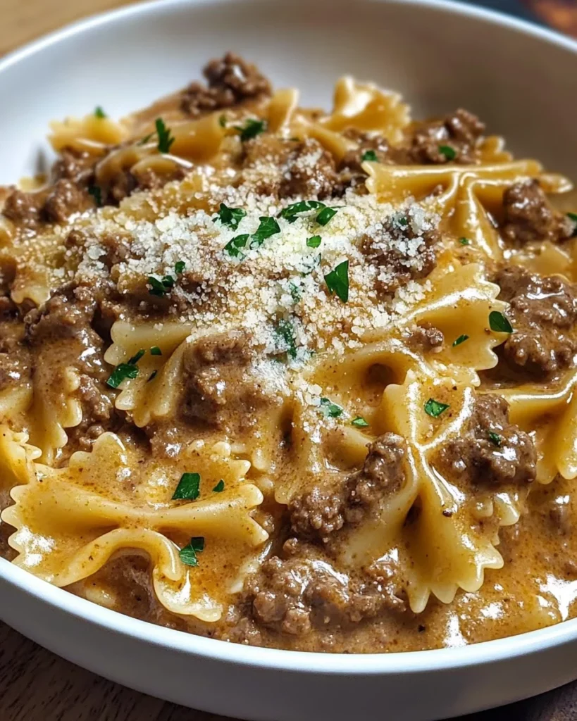 A creamy and flavorful pasta dish made with ground beef, garlic, and Parmesan cheese, served over bowtie pasta.