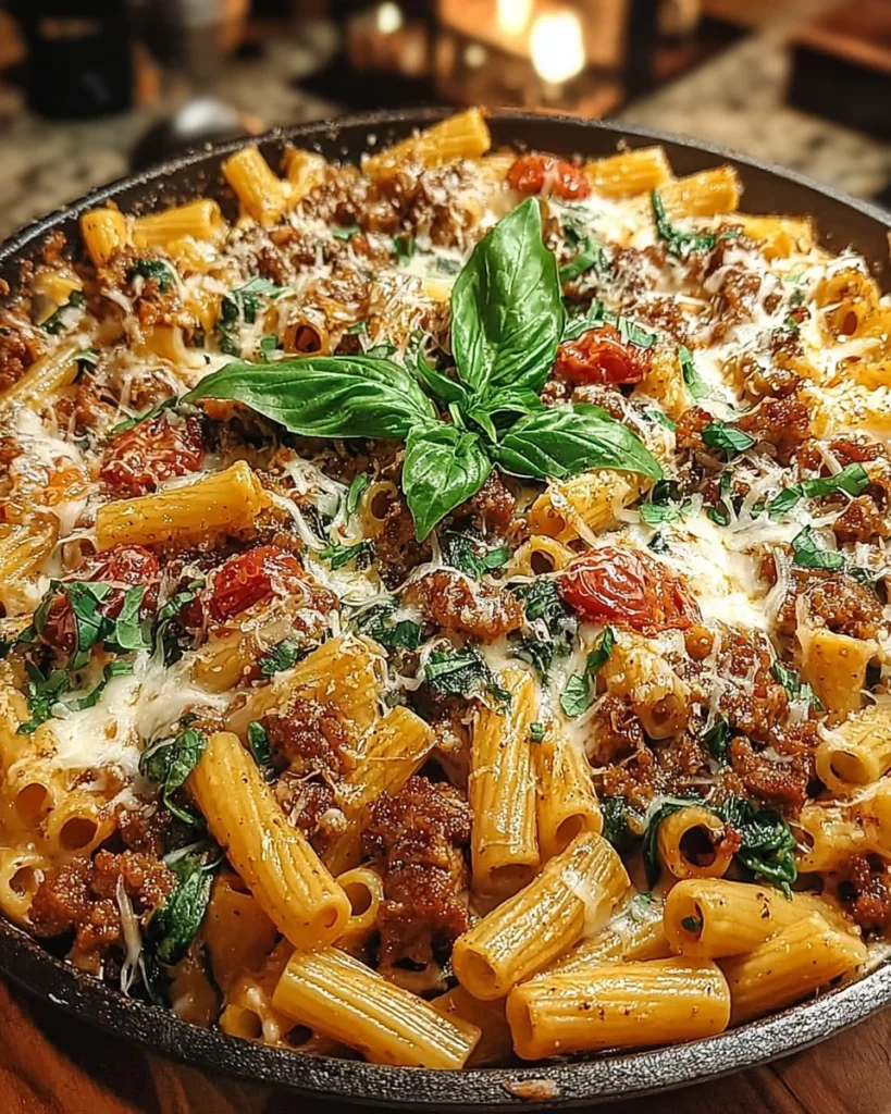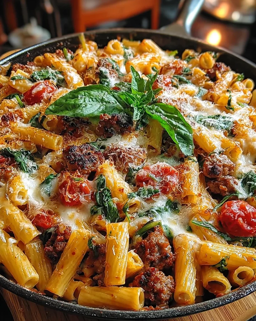 A delicious and creamy pasta bake featuring Italian sausage and fresh ingredients, perfect for a comforting dinner.