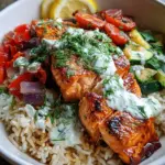 - Assemble the Bowls: Top crispy rice with sautéed vegetables. Place a salmon fillet on each bowl. Drizzle with lemon-yogurt sauce, garnish with fresh herbs, and serve with lemon wedges.