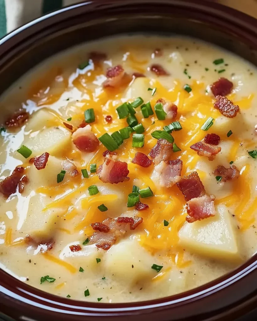 A cozy and hearty soup made with diced potatoes, cheese, and bacon, perfect for cold days.