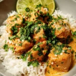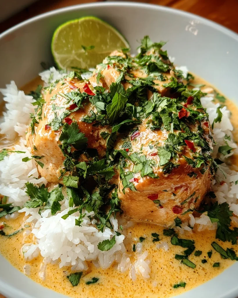 A flavorful and tropical dish featuring tender chicken cooked in a coconut milk sauce with lime.