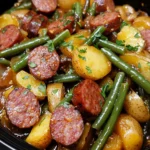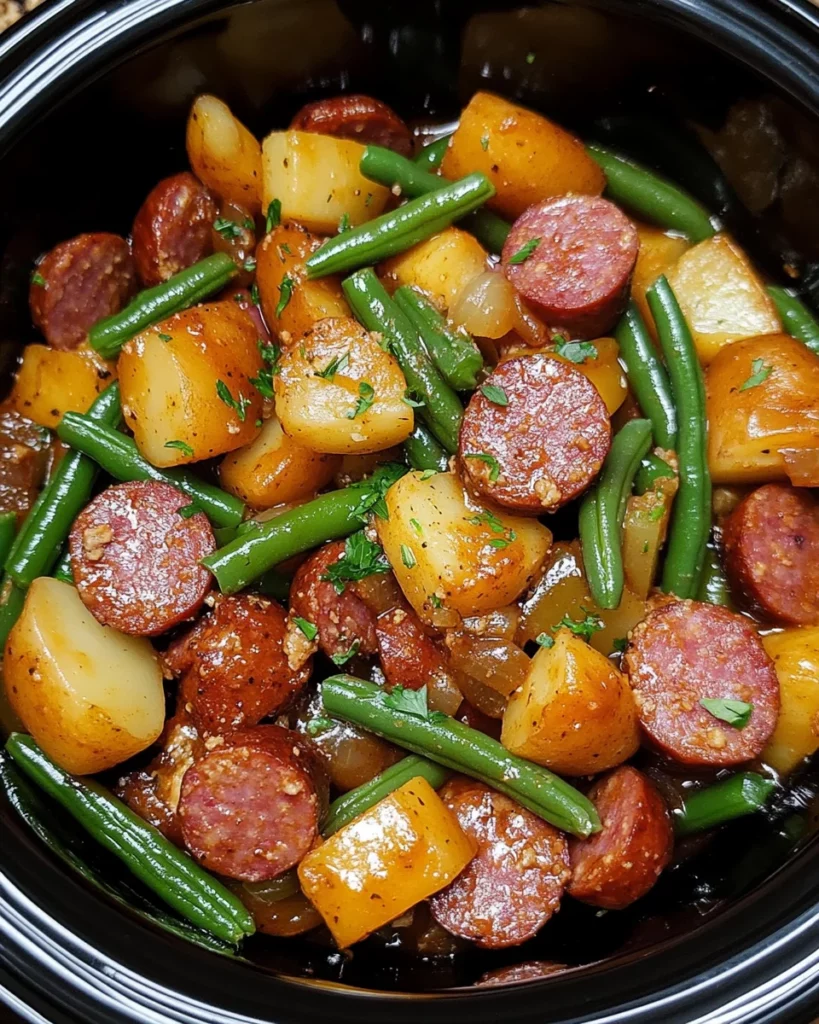 Crockpot Kielbasa and Green Beans is a hearty and flavorful dish made with smoked sausage, fresh green beans, and baby potatoes, all cooked slowly to perfection in a crockpot.