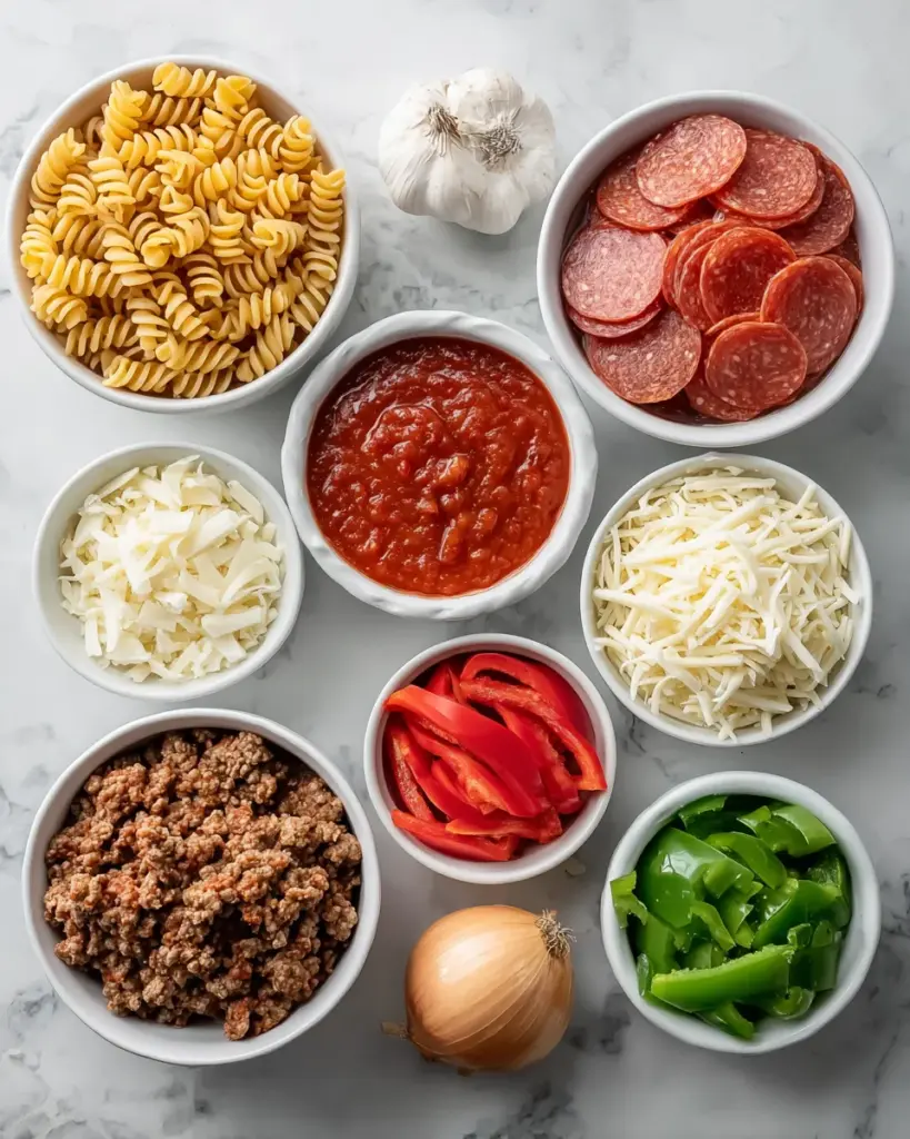 Gathering the right ingredients is key to whipping up this Crockpot Pizza Casserole. Here’s what you need: