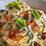 Crockpot Tuscan Chicken is a creamy and flavorful dish featuring tender chicken breasts cooked in a rich sauce with sun-dried tomatoes, spinach, and Parmesan cheese.