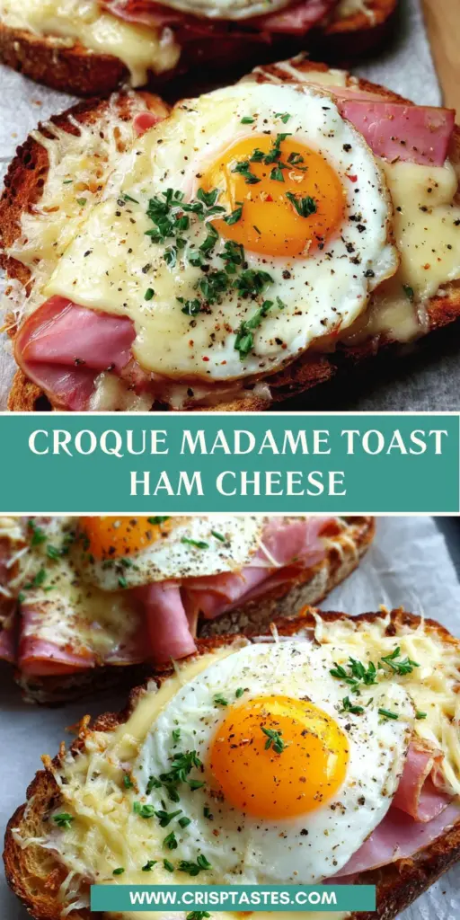 This Croque Madame Toast Ham Cheese has a special place in my heart, mixing comfort and sophistication in every bite. It’s not just a meal; it’s an experience—sharing it with loved ones around the table creates beautiful memories. With its crisp toast, decadent Mornay sauce, and that perfectly drizzled egg yolk, it brings joy to my busy mornings or leisurely weekends alike. Whether you serve it for breakfast or a cozy brunch, the smiles it brings are truly priceless. So roll up your sleeves, and enjoy this delightful recipe—you deserve it!