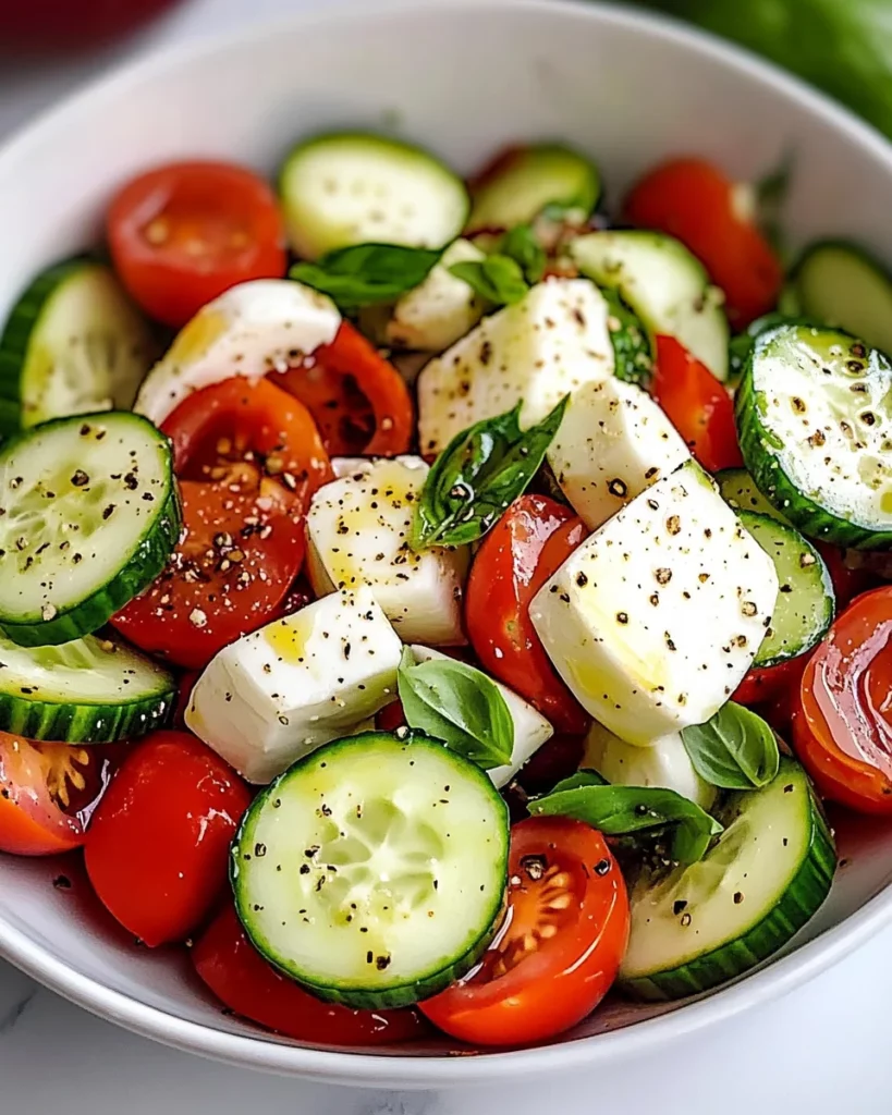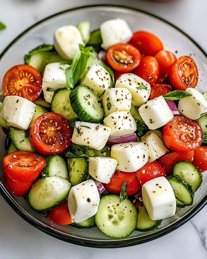 A refreshing salad that combines crisp cucumbers, juicy cherry tomatoes, and creamy mozzarella, drizzled with olive oil and balsamic glaze.