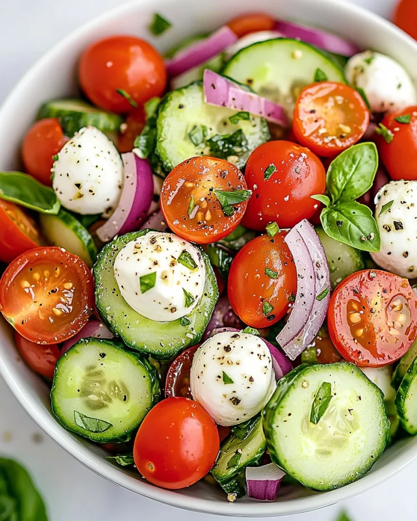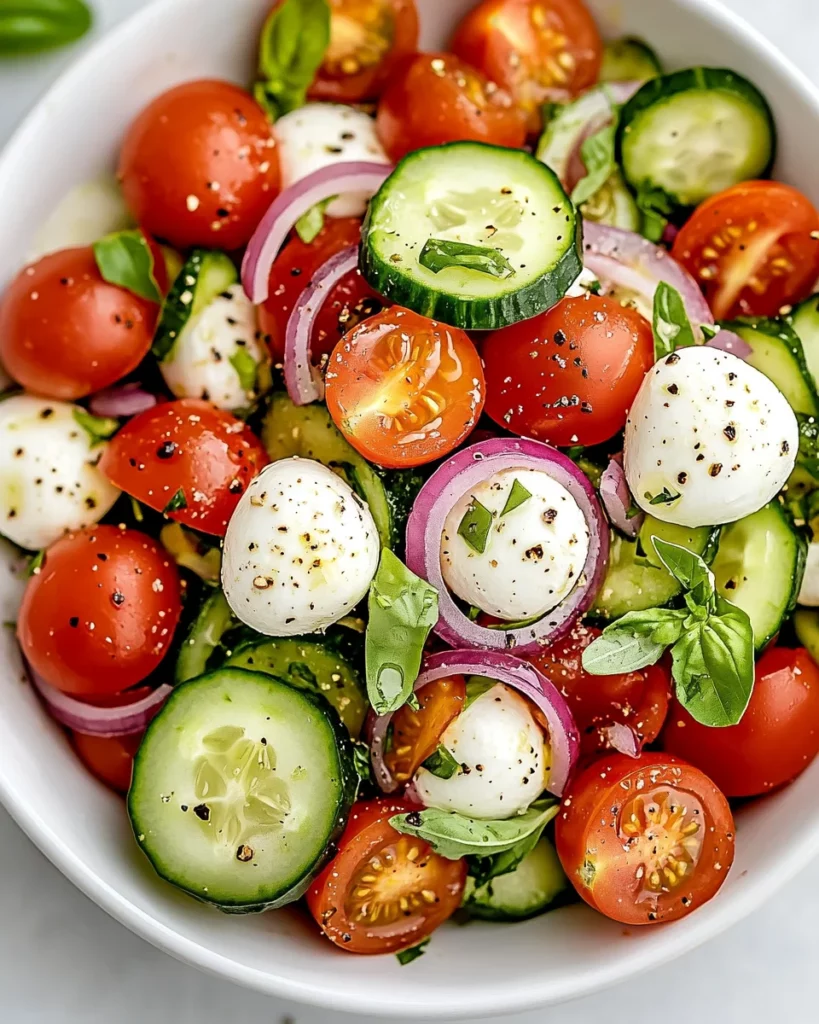 A refreshing summer salad featuring crisp cucumbers, juicy cherry tomatoes, creamy mozzarella, and avocado, all drizzled with a light dressing.