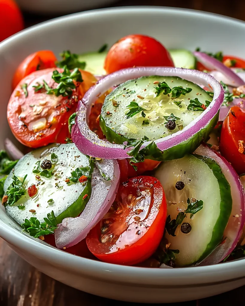 Can I change the vegetables in this salad? Of course! Feel free to mix in things like bell peppers, radishes, or even corn for added crunch and flavor. The beauty of this Cucumber, Onion, and Tomato Salad is its versatility!