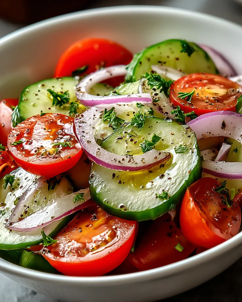 A refreshing salad made with cucumbers, tomatoes, and onions, perfect for any meal.