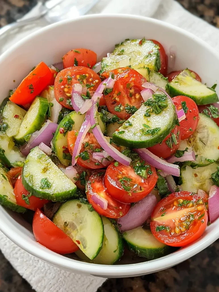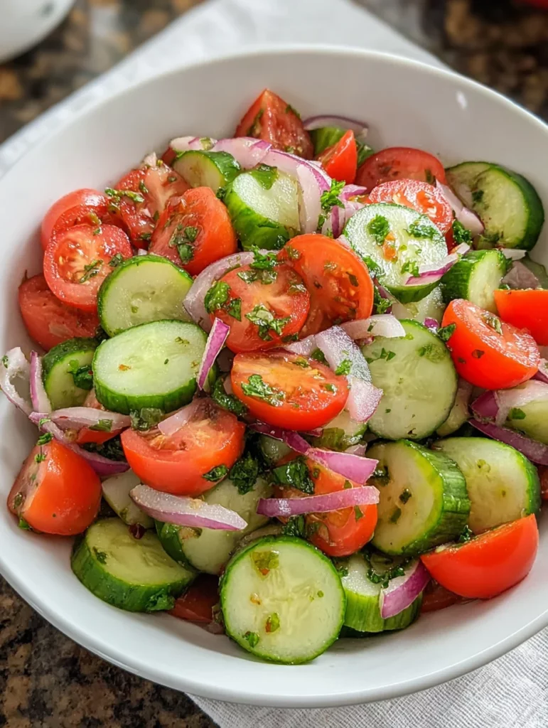 A refreshing salad that combines crisp cucumbers, sweet cherry tomatoes, and tangy red onions, all dressed in a light vinaigrette.