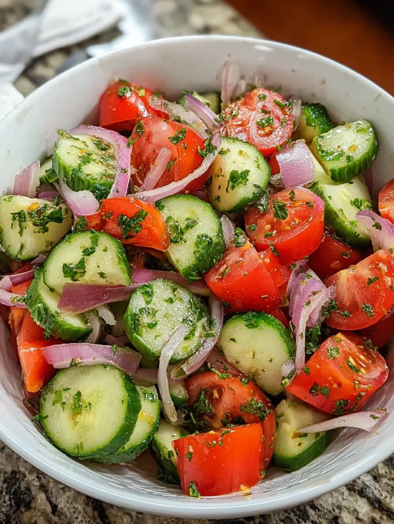 A refreshing salad that combines crisp cucumbers, sweet cherry tomatoes, and tangy red onions, all dressed in a light vinaigrette.