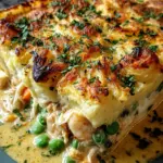Transfer the filled mixture into a baking dish. Spread that creamy filling evenly, then lavishly top it off with your mashed potatoes. Get creative and rough up the top with a fork; it adds texture that will crisp beautifully in the oven!