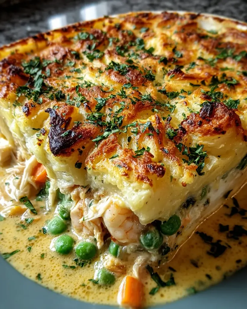 A delicious twist on the traditional fish pie, featuring curried flavors and a variety of seafood.