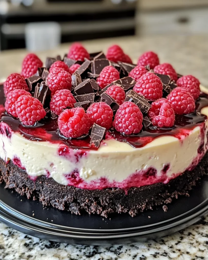 A rich and decadent dark chocolate raspberry cheesecake that combines the flavors of chocolate and tart raspberries, perfect for impressing guests.