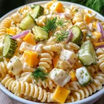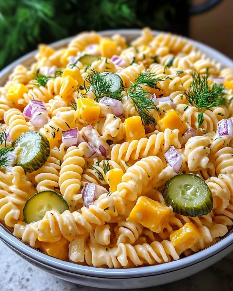 A deliciously tangy and creamy pasta salad featuring dill pickles and cheddar cheese, perfect for summer gatherings or a quick meal.