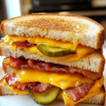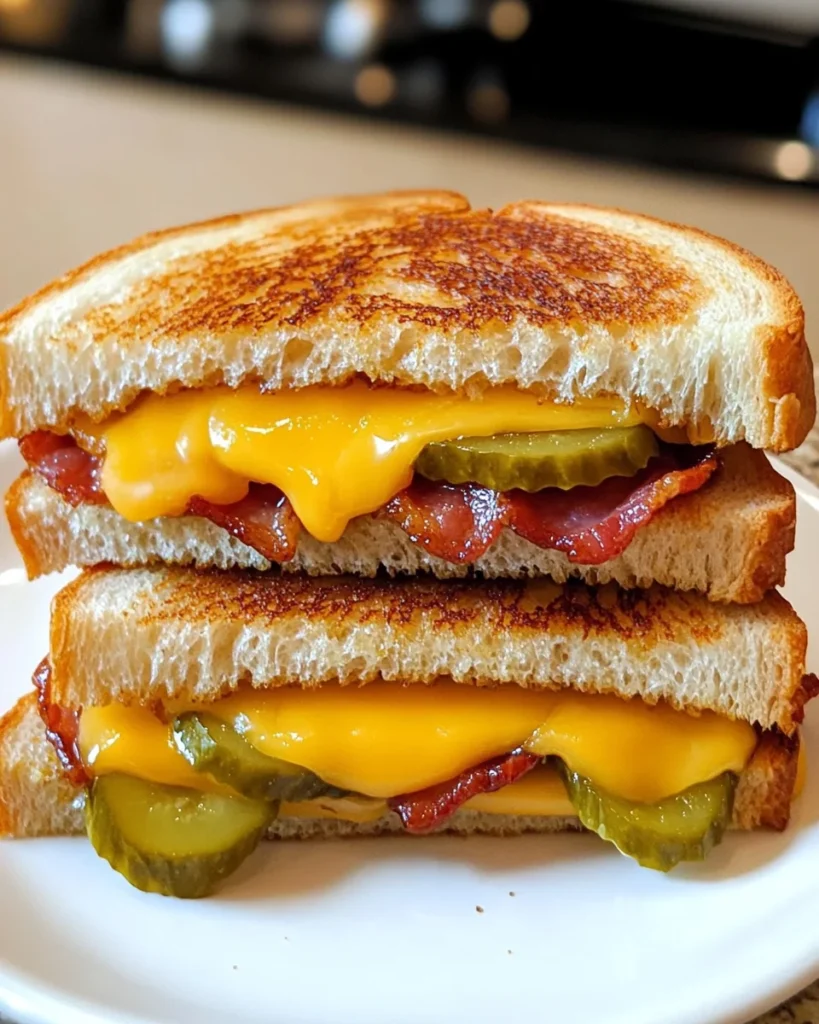 A delicious twist on the classic grilled cheese sandwich, featuring crispy bacon and tangy dill pickles.