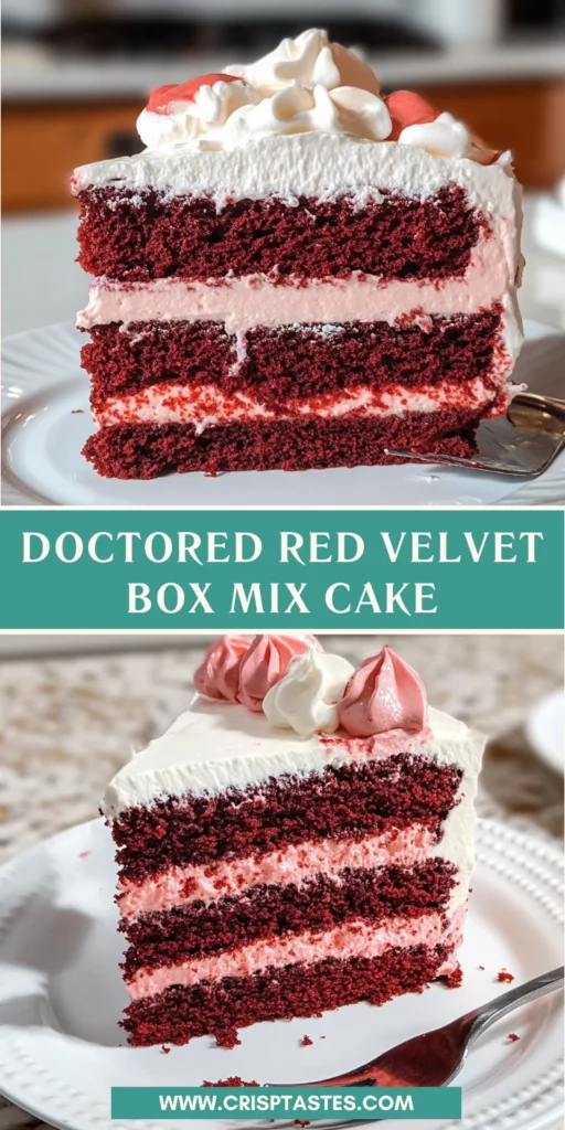 Creating my Doctored Red Velvet Box Mix Cake is more than just a baking task; it’s a joyful experience that brings smiles all around. The magic of transforming a simple boxed mix into a celebratory masterpiece is truly special. With its rich color and decadent flavors, this cake has a way of turning everyday moments into cherished memories. Whether it’s a birthday, an anniversary, or simply a night to treat yourself, this recipe is a reminder that deliciousness can be quick and effortless. Embrace the process, and don’t forget to savor every delightful bite!