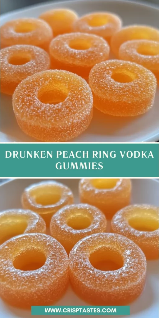 Making Drunken Peach Ring Vodka Gummies is more than just kitchen fun; it’s a delightful experience that brings joy and laughter to any gathering. The thrill of watching your loved ones savor each chewy, peachy bite is truly heartwarming. As you experiment with flavors and share them with friends, you create sweet memories that linger long after the last gummy is gone. Whether it’s a casual get-together or a lively party, these gummies are sure to add a splash of color and excitement. Get ready to spread smiles and savor the sweetness of life, one gummy at a time!