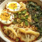 Dumpling Ramen Bowl Soup is a comforting and quick dish that combines flavorful broth with dumplings, noodles, and fresh vegetables.