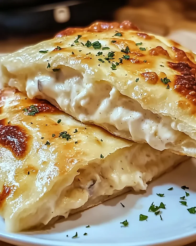 - Serve & enjoy: Let the calzones cool slightly before serving. Enjoy with extra Alfredo sauce for dipping!