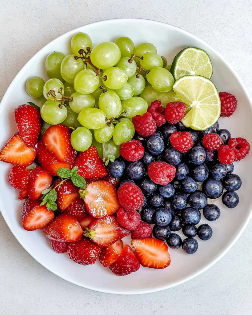 Let’s start with a fresh foundation! First, wash all your fruits under cold running water. For those strawberries, chop off the leafy tops and slice them into bite-sized pieces. If you’re using larger grapes, cut them in half. Raspberries and blueberries? They’re ready to go as they are. Lastly, carefully scoop out the pomegranate arils. Combine all these colorful fruits in a large mixing bowl, embracing their vibrant hues and mouthwatering smells.