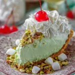 Once chilled, it’s time for the grand finale! Pipe your whipped cream on top of the pie. Sprinkle with chopped pistachios for an added crunch, and finish with a few maraschino cherries for a pop of color. This little touch makes the pie look as inviting as it tastes!