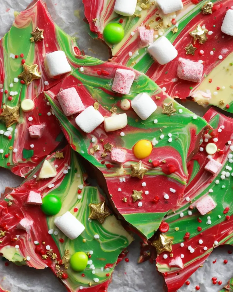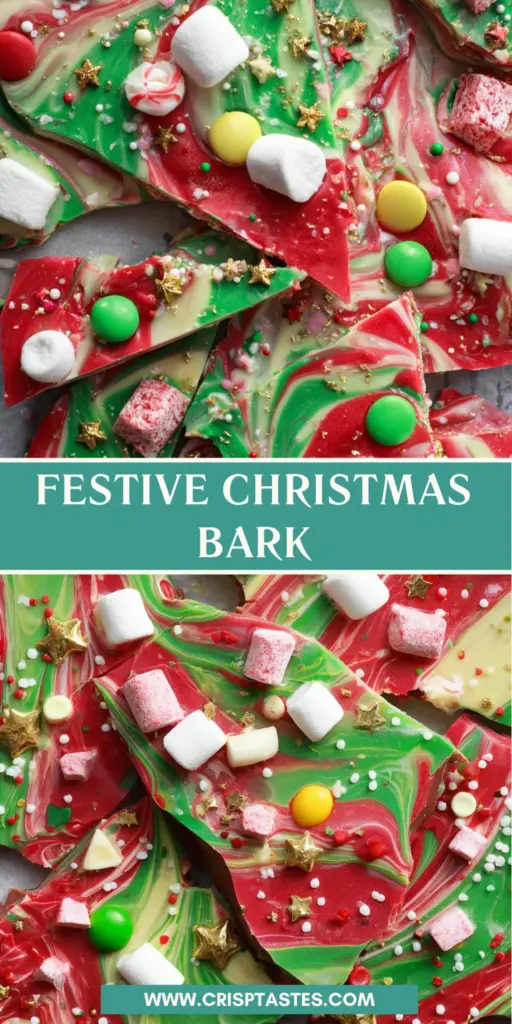 Festive Christmas Bark is a delightful holiday treat made from colored chocolates and various toppings, perfect for celebrating the festive season.